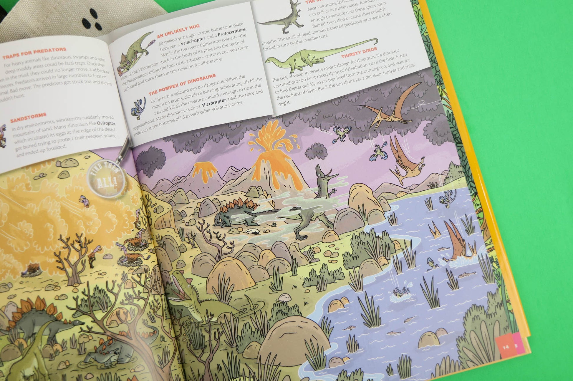 Take a trip back through time and find the hidden dinosaurs on each page!