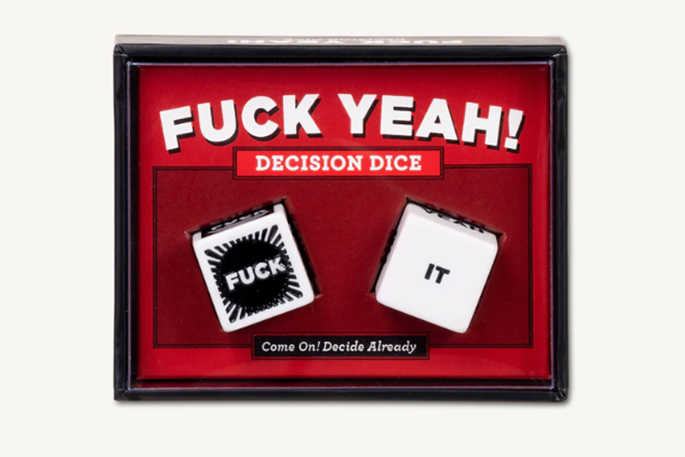 Address life's tough decisions with a roll of the dice! Two 6-sided dice—one that says "fuck" on all sides, and the other with words like "yeah" and "no"—combine to give you the answers you've been looking for. Your decision-making process just got a whole lot easier—so, what the f*ck are you waiting for?
