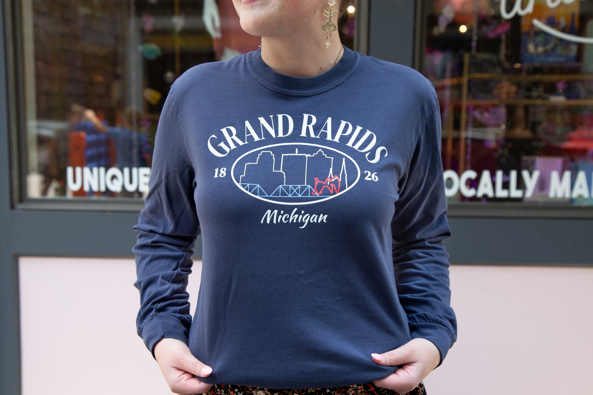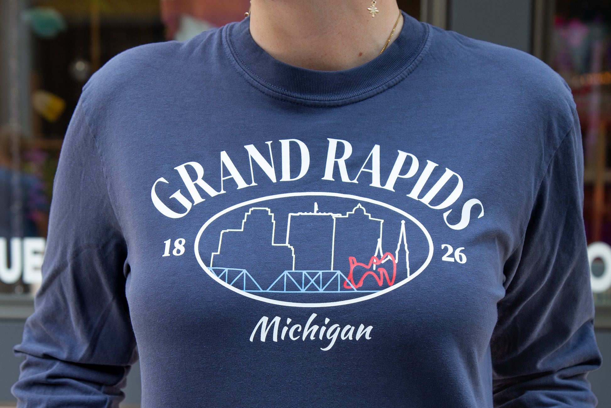 Show your love of Grand Rapids with this screen printed skyline tee with the year the first trading post was built on the shore of the Grand river.