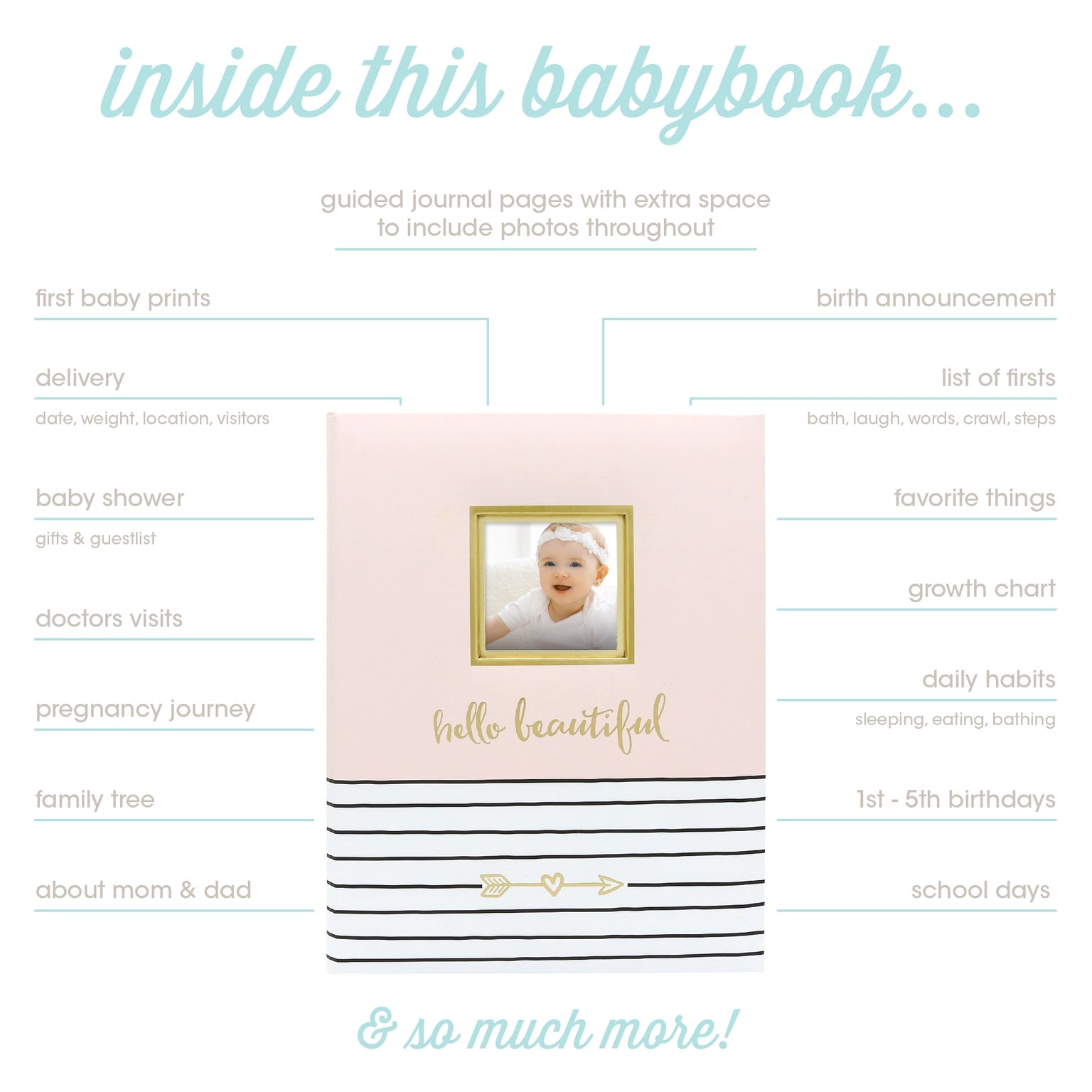 Introducing the 'Hello Beautiful' baby book, with its charming fonts and 50 pages, perfect for capturing and sharing your precious stories. The stylish cover includes a 3” x 3” slot for your favorite baby photo