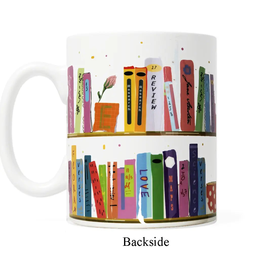 This book themed coffee mug would make a great gift for any book lover and coffee lover! Two stacked book shelves wrap around this fun and colorful ceramic mug!