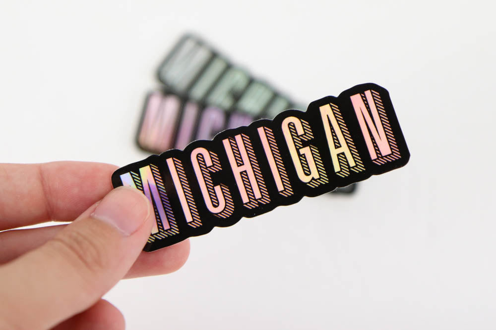 Share your love of Michigan with this three inch vinyl holographic sticker. Great on water bottles and laptops.