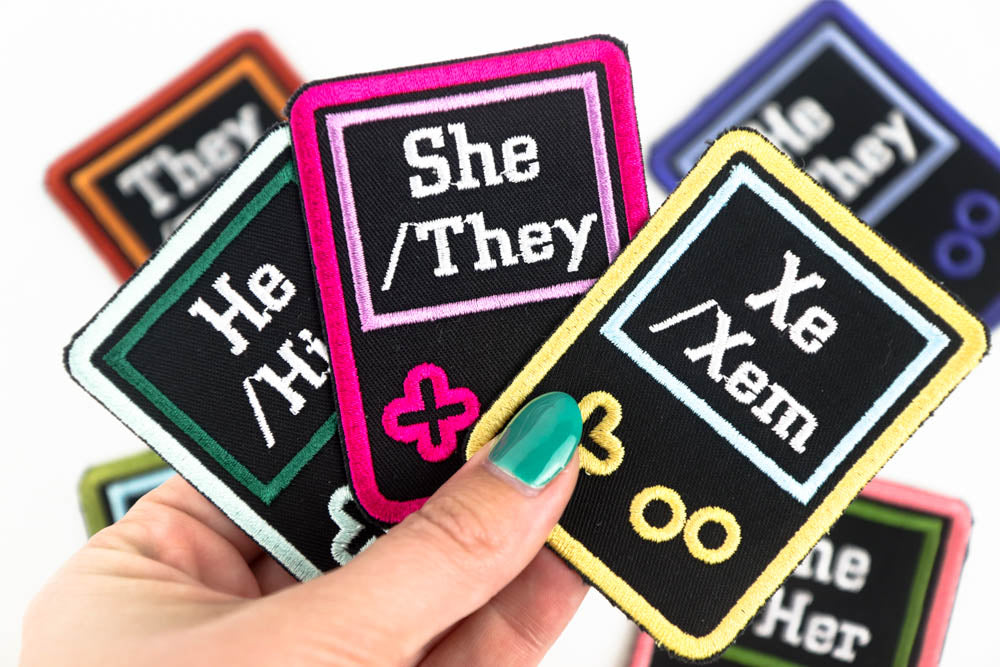 Pronoun heat transfer patches for your jackets, bags, and more. These are approx. 4x2 inches and are embroidered on our embroidery machine in our retail store in Grand Rapids, Michigan.