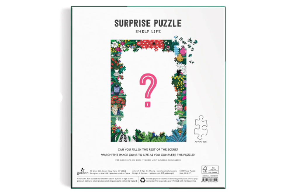 Shelf Life 1000 Piece Surprise Puzzle features a botanical-themed surprise image. Some elements are presented on the box and the insert, but the complete scene emerges as the puzzle is assembled for a truly one-of-a-kind puzzling experience. Packaged in matte-finish sturdy boxes, perfect for gifting, reuse, and storage. An insert of the full puzzle image is also included.